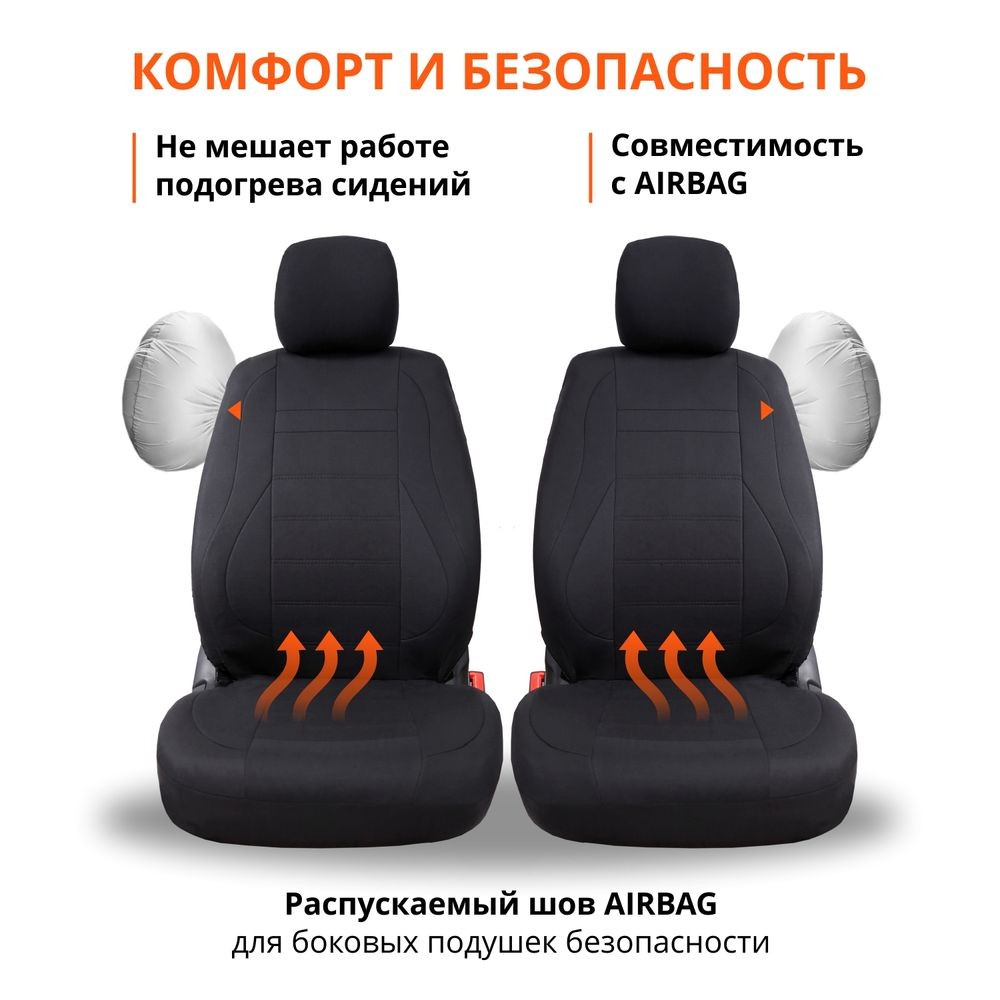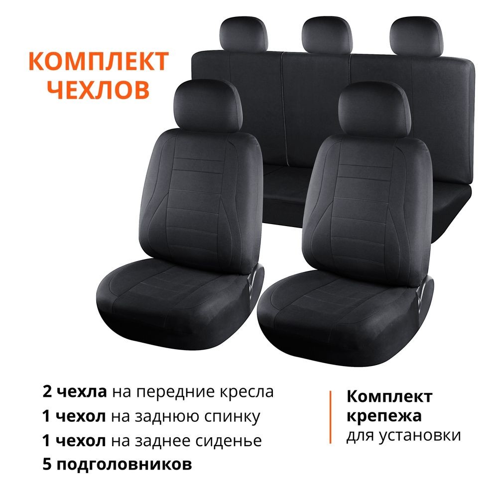 В комплект входят авточехлы универсальные на передний и задний ряд автомобильных сидений, включая подголовники, а также специальные крепежи для простой установки. Совместимы с Airbag.